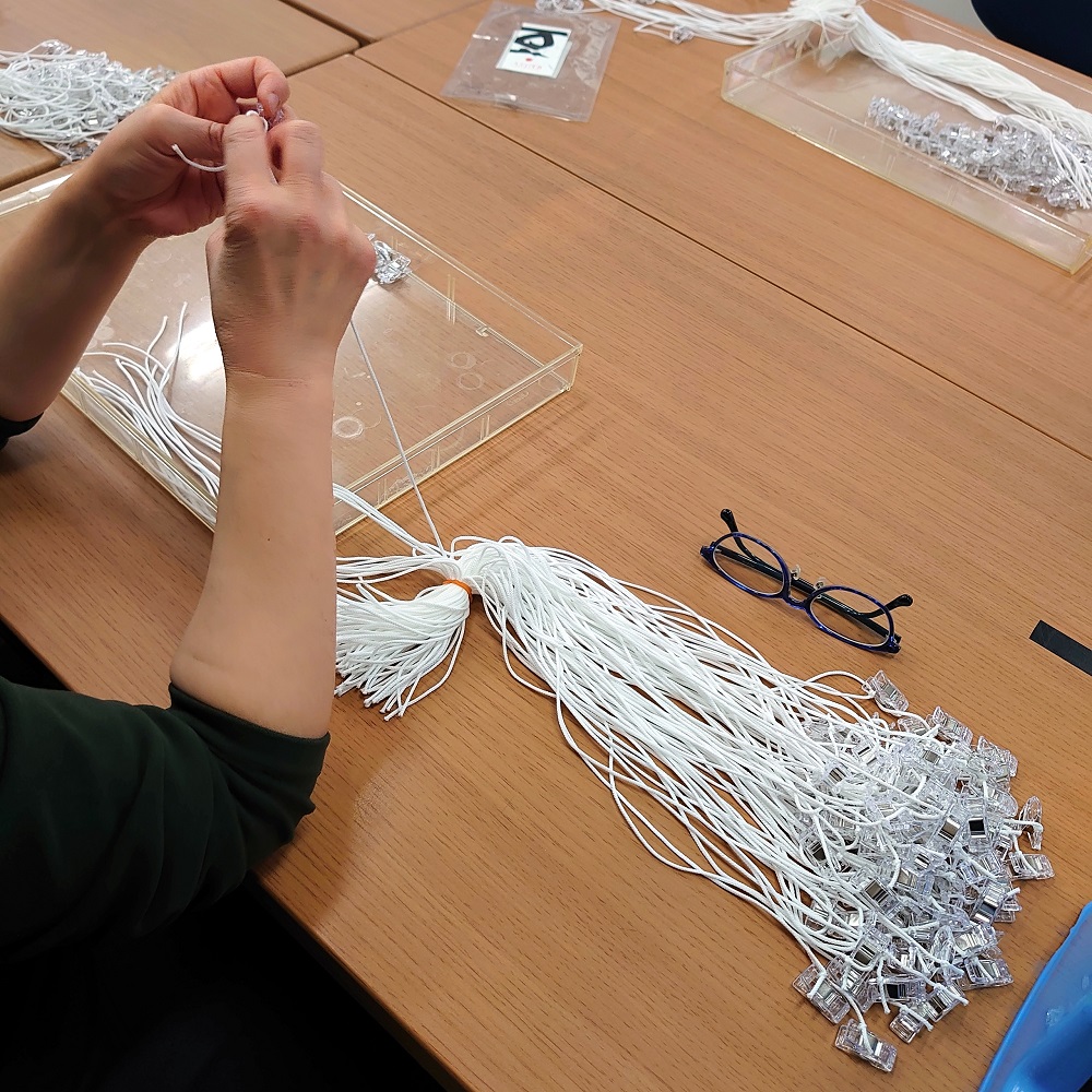 紐の取り付けは結び方が決まっていて、紐の結び目のきつさや結んだあとの紐の長さなど、気をつけることがとても多い作業です。