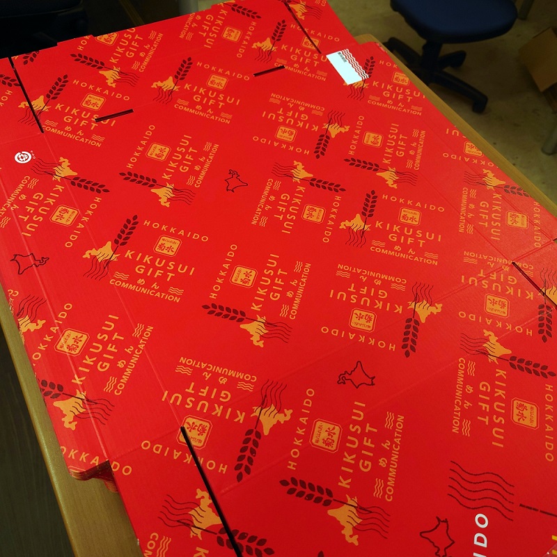 お歳暮に使われるのかな?といつも思うのですが、ギフト用のラーメンの箱に、品名や原材料名、製造者などが書かれたシールを貼る作業です。
