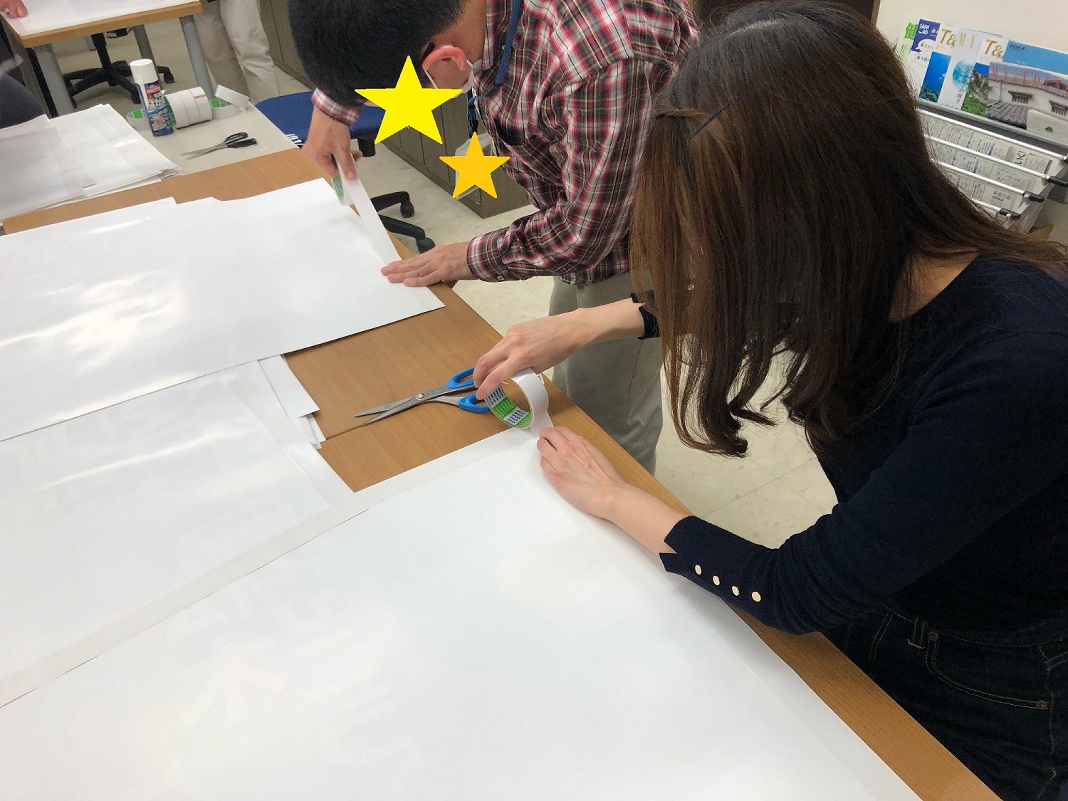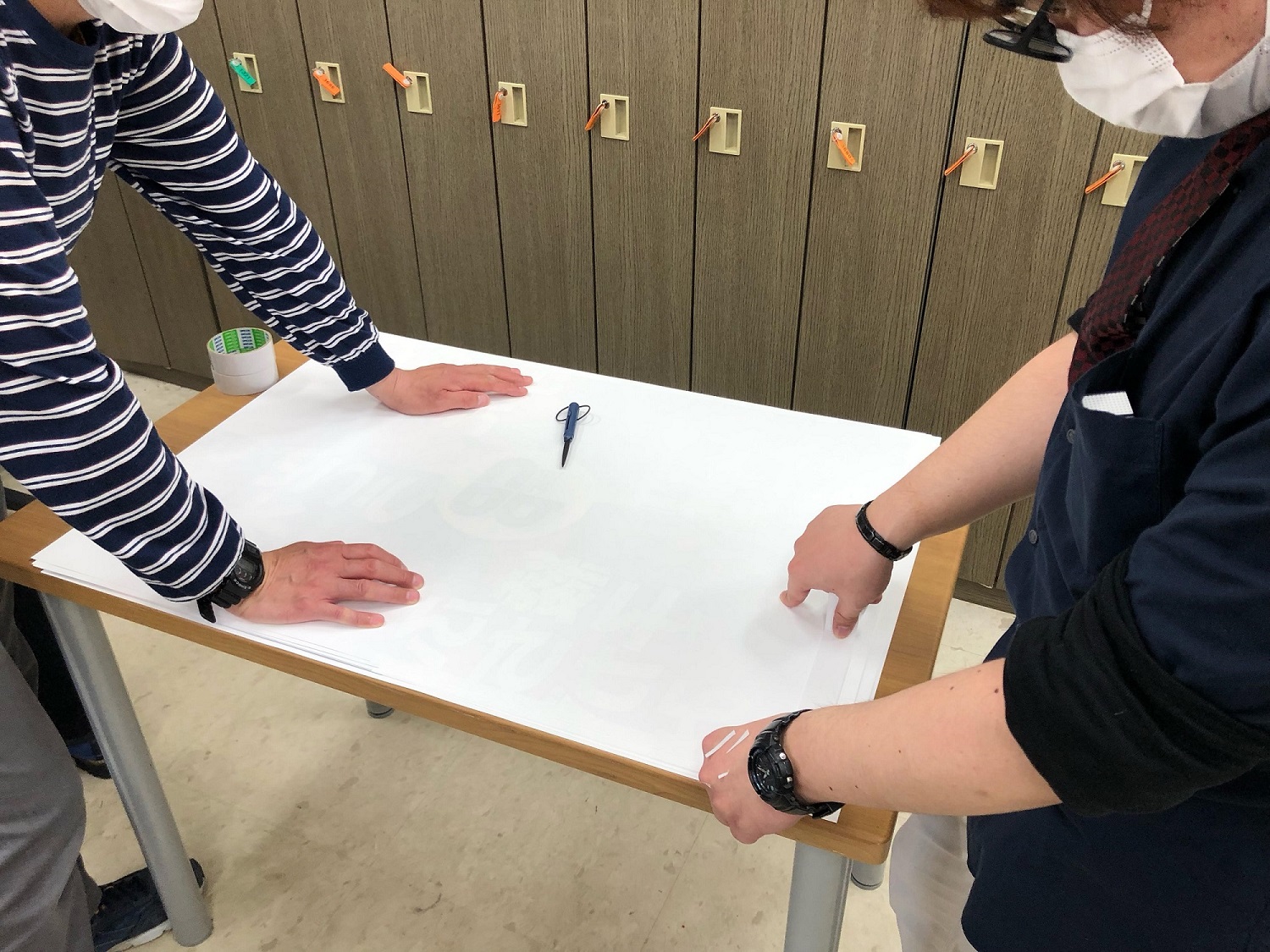 二人一組で作業を行う場合は、一人がポスターを押さえ、もう一人が両面テープを貼っていきます。