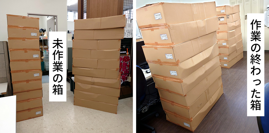 例年、表のシールを貼るグループ、裏のシールを貼るグループに分かれて作業をしていました。