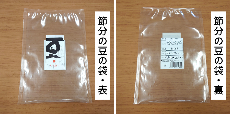 節分の豆の袋にシールを貼る作業です。