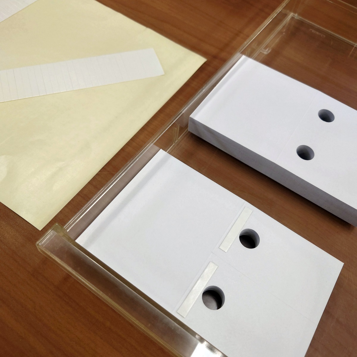 香りサンプルの台紙にシールを貼る作業です。