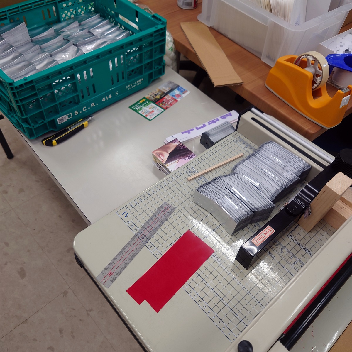 この後、封筒の中に入れるチラシ等を帳合し、三つ折りして、封入して、封緘します。