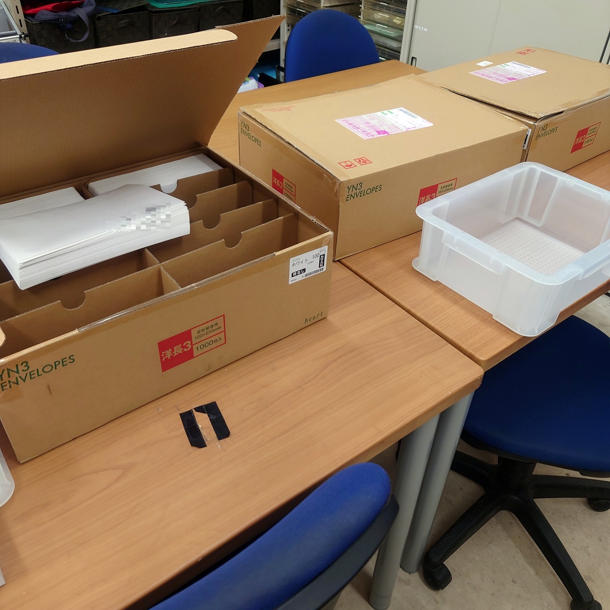 DMの封筒に宛名シールを貼る作業です。