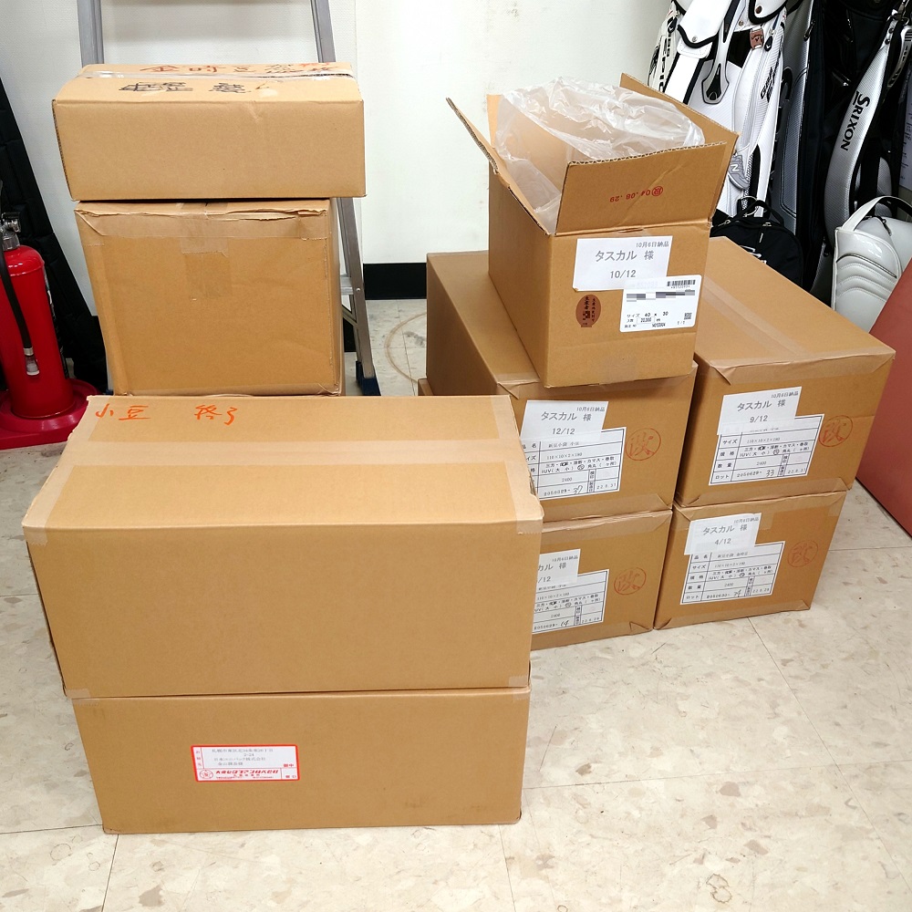 タスカルの入口に、たくさんの段ボールが山積みになっています。