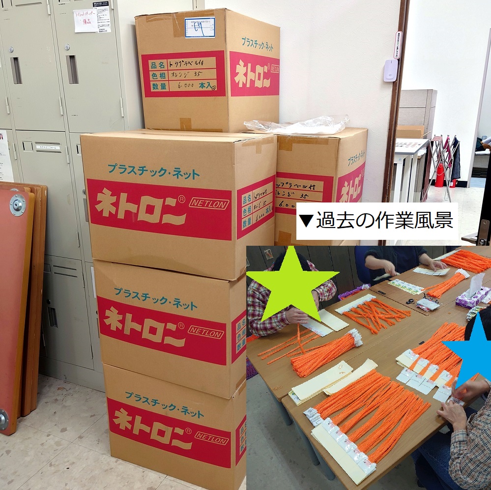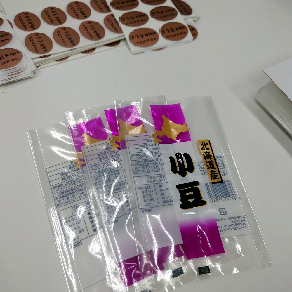 ▲豆を入れる袋が入った箱。これもシールを貼る作業です。