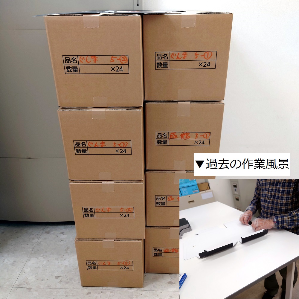 ▲組み立て前のお菓子の箱が入っています。箱の組み立ての作業です。