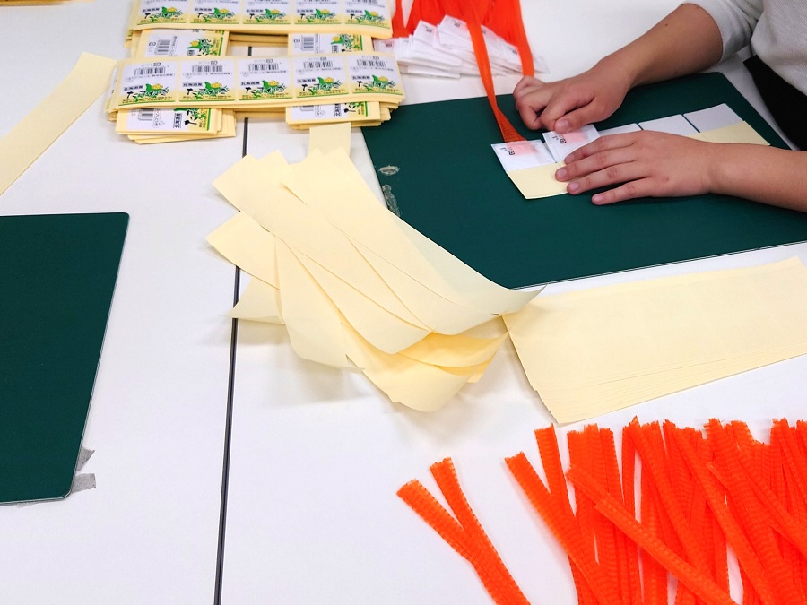 以前は、1人で100本、シールを貼って折り畳むという作業をしていましたが、数年前からひたすら貼る、ひたすら折り畳むという作業に手順になりました。