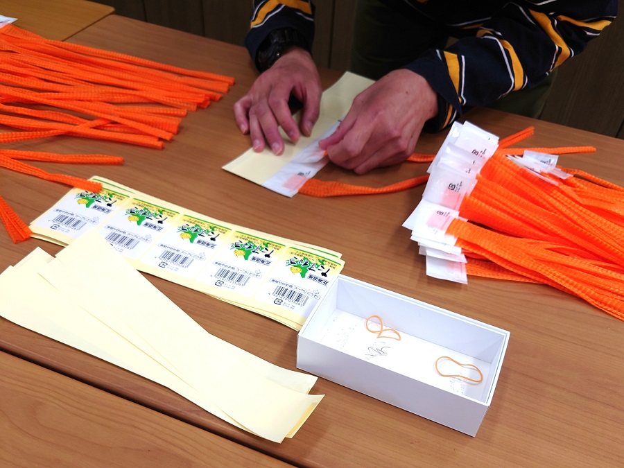 玉ねぎを入れるネットに、シールを貼りつける作業です。