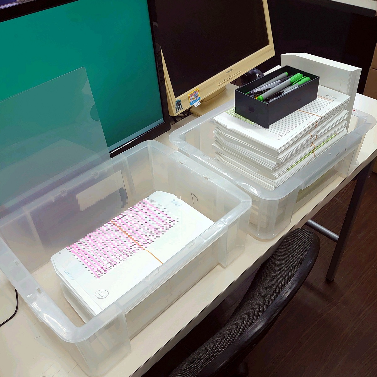 印をつける作業の方が早いこと、場所が限られていることから、このような流れ作業で進めています。
