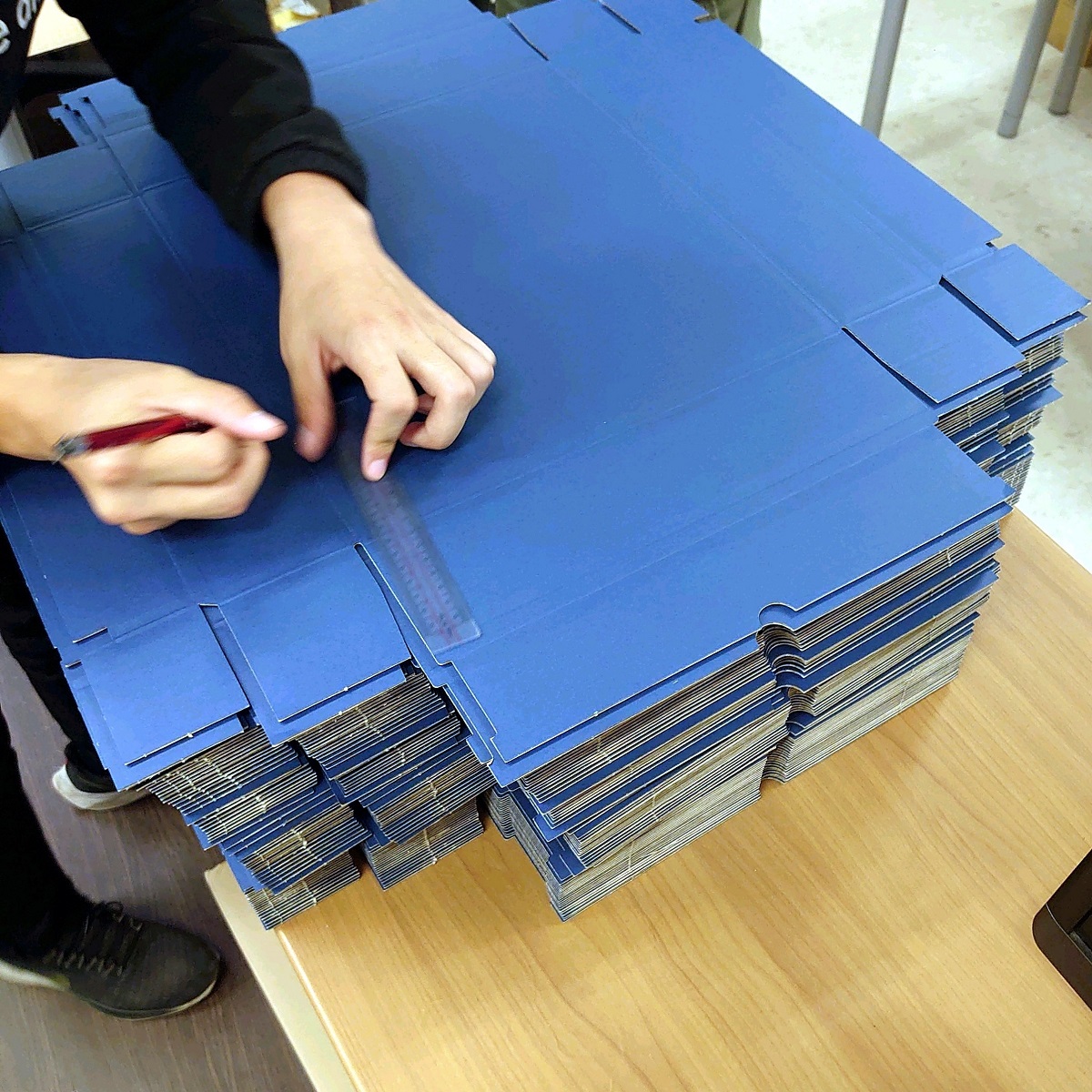段ボールからギフト用の箱を取り出し、1枚1枚印をつけていきます。