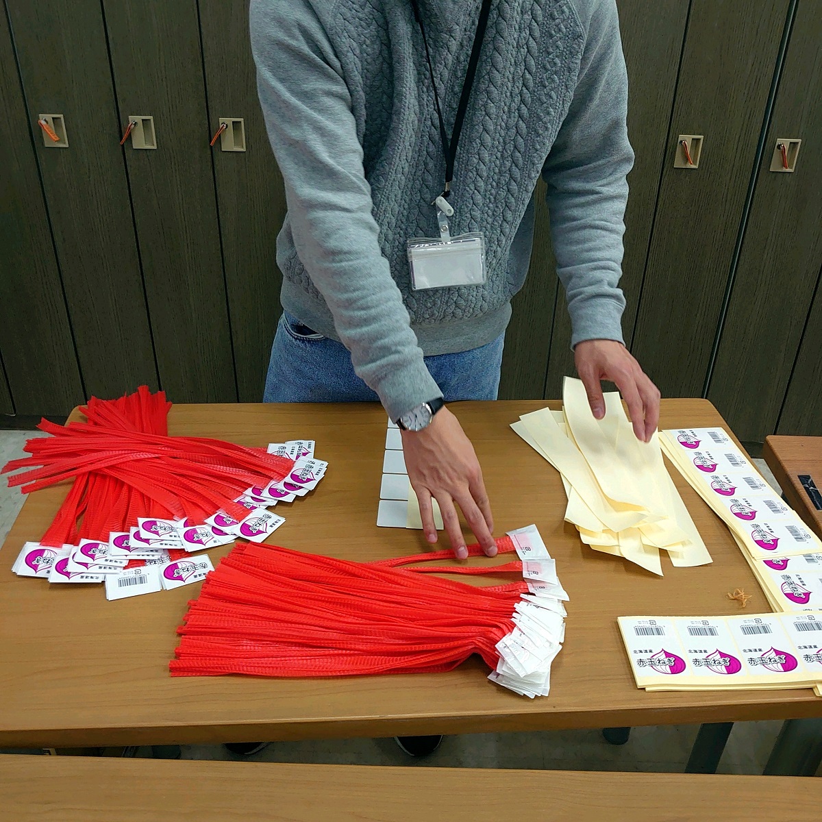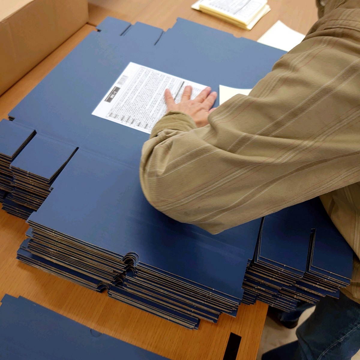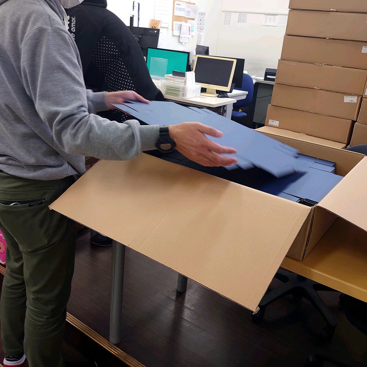 収納された箱をもう一度取り出し、シールを貼る人。