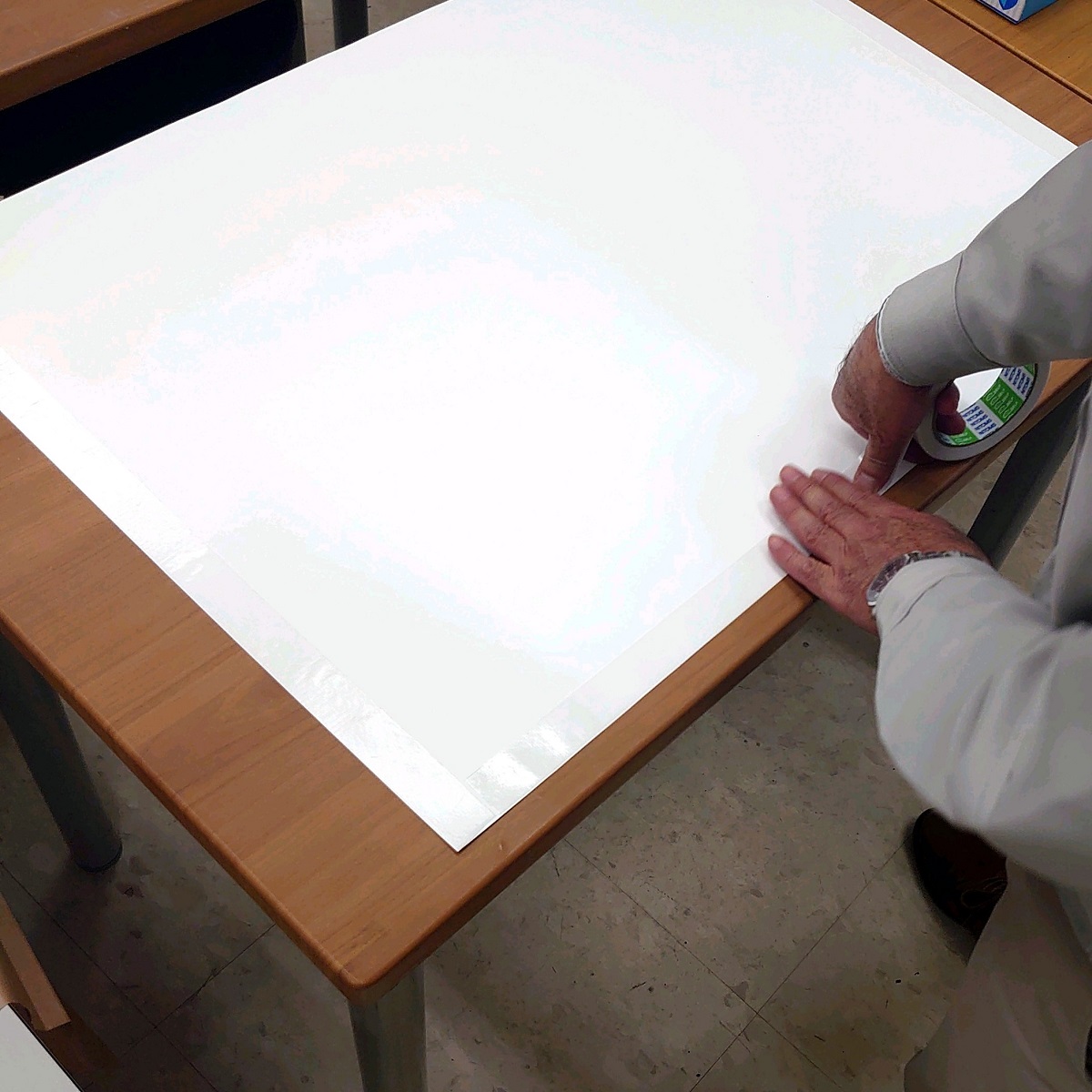 ポスターからはみ出ないように、テープが皺にならないように、できるだけ際にテープを貼っていきます。