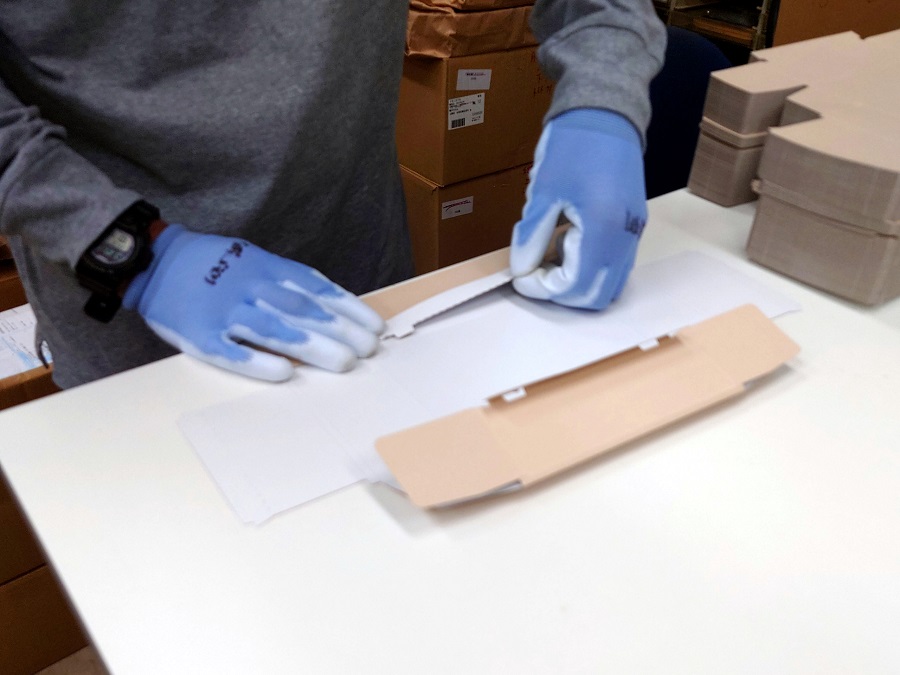 箱の組み立ては手袋を履いているので、細かな折り曲げが大変そう😲