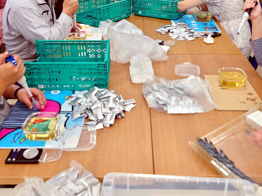 今日のタスカルの施設内は、箱の組み立てと、香りサンプルの液入れをしています。
