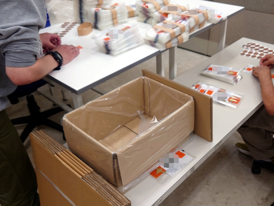 香りサンプルの液詰め、食品のシール貼り、宛名書きに分かれて作業をしています。