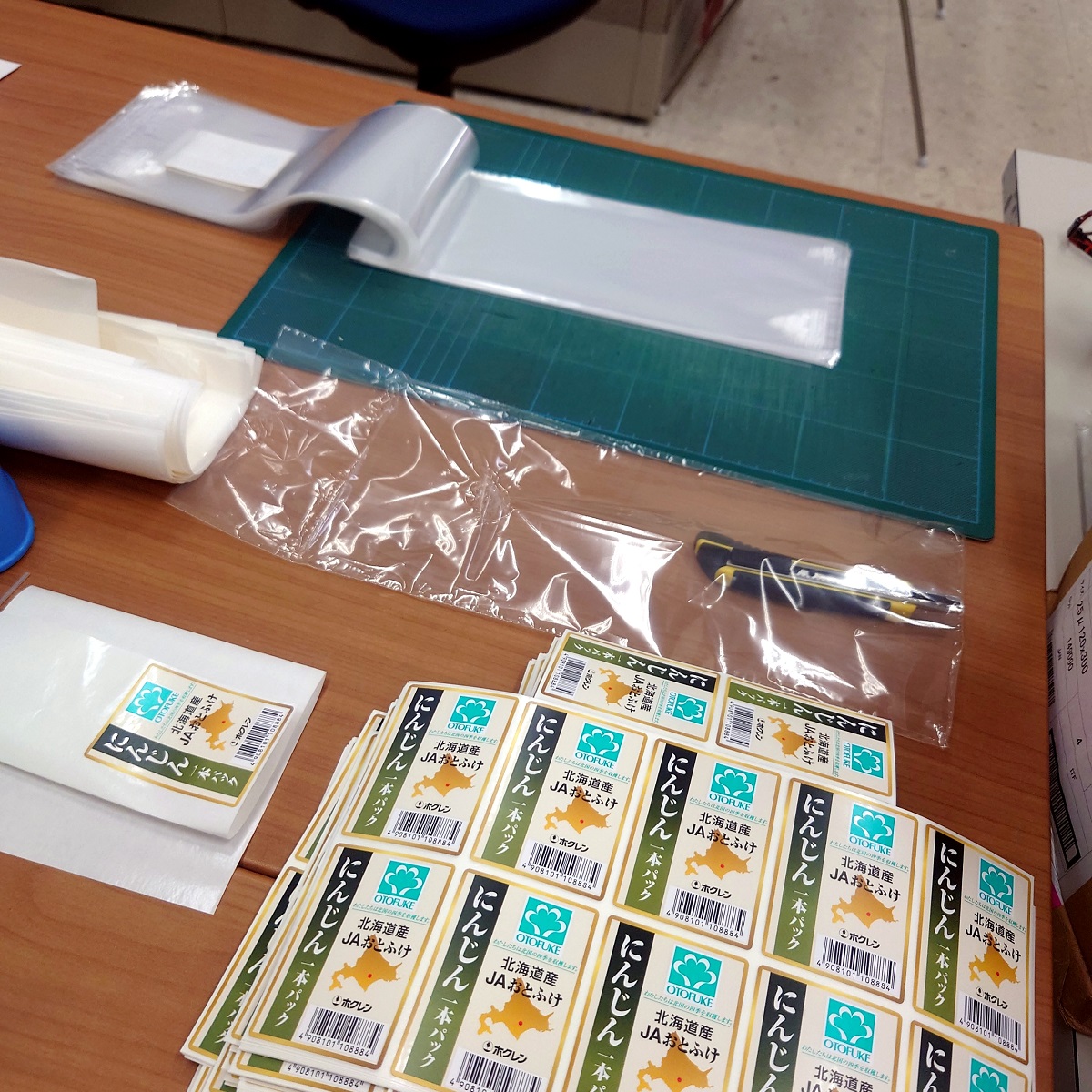 人参を入れるための袋にシールを貼る作業。