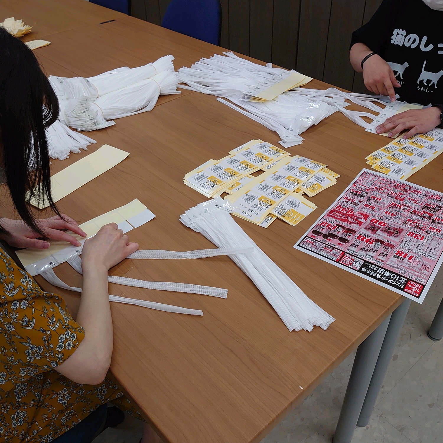 この作業は、シールを貼る人とシールを折る人に分かれて行っています。