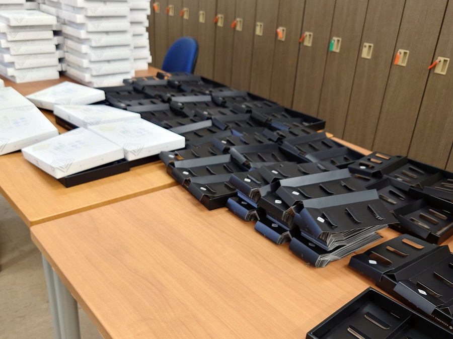 雑然としているように見えますが、先に組み立てた蓋、下箱、仕切りをセットしておくことで、仕切りを入れるだけに専念、蓋をするだけに専念ができます。