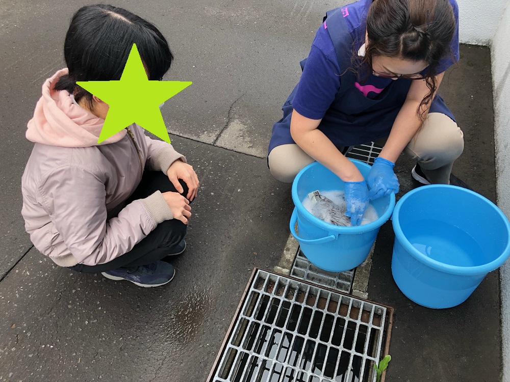 清掃未経験のメンバーが、モップを洗っているところを見学している写真でした😆