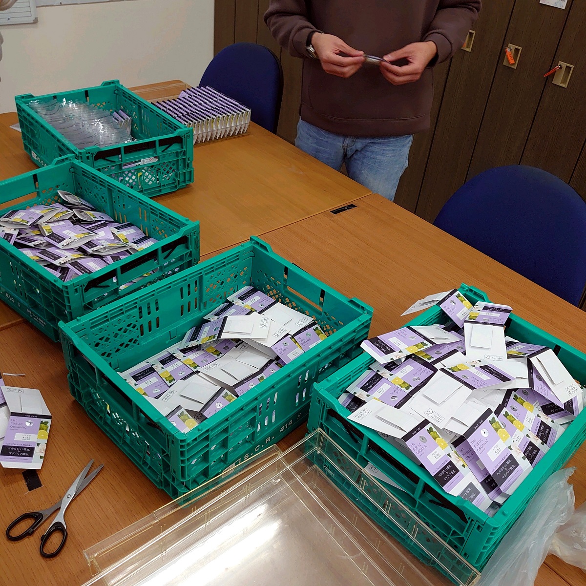 作業内容としては、香りを染みこませるためのスポンジをアルミ袋に詰める作業。