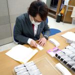 香りサンプルの台紙にシールを貼る作業中。Rさんに感想を聞いてみました