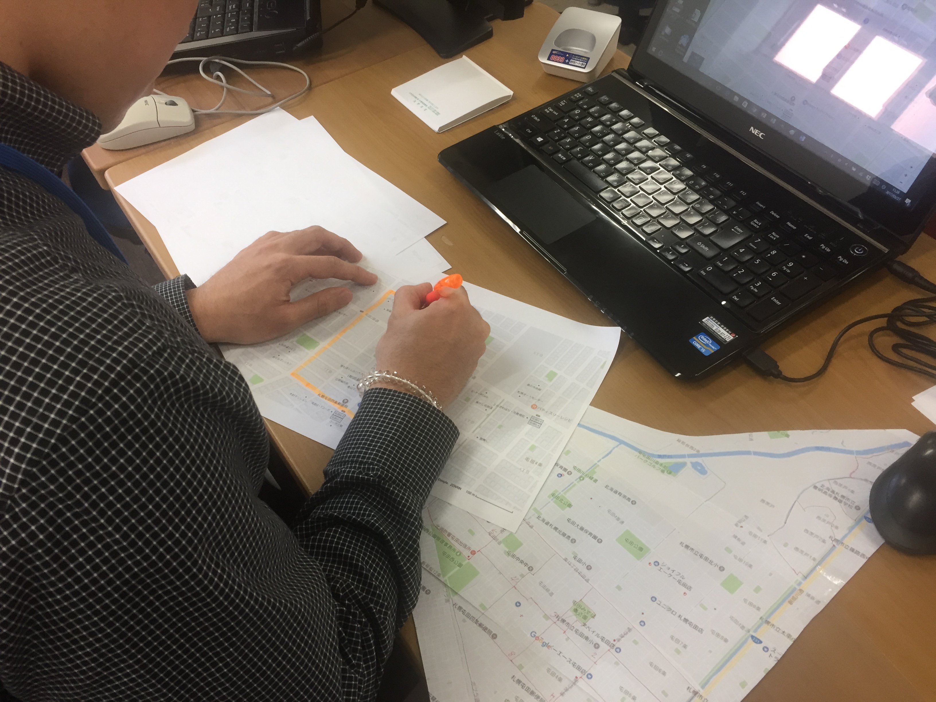 ポスティング作業を効率よく進めるためメンバーさんが地図を確認し区間分けを行っています。
