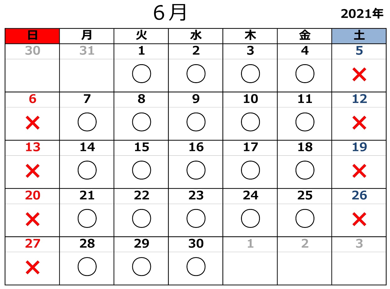 2021.05.21お知らせ 令和3年6月の開所日のお知らせ 黒〇=開所日 赤✕=閉所日 ※タスカルでは、基本「土」「日」「祝日」はお休み とさせていただきます。 また、各種お問い合わせは 平日9:00~18:00にお願いいたします。 お問合せ TEL 011-717-5211 FAX 011-717-5212