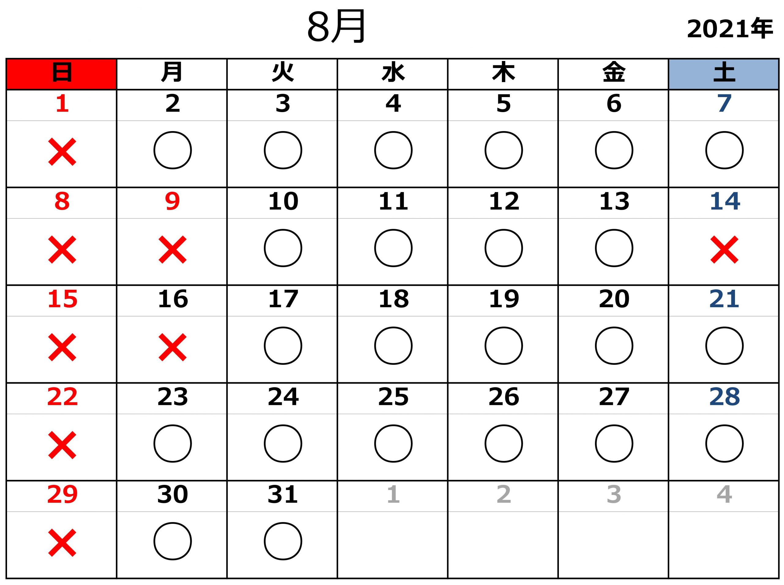 2021.07.21お知らせ 令和3年8月の開所日のお知らせ 黒〇=開所日 赤✕=閉所日 ※タスカルでは、基本「土」「日」「祝日」はお休み とさせていただきます。 また、各種お問い合わせは 平日9:00~18:00にお願いいたします。 お問合せ TEL 011-717-5211 FAX 011-717-5212
