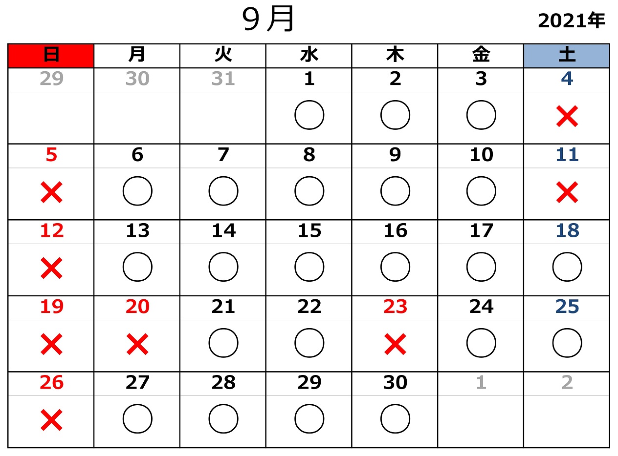 2021.08.26お知らせ 令和3年9月の開所日のお知らせ 黒〇=開所日 赤✕=閉所日 ※タスカルでは、基本「土」「日」「祝日」はお休み とさせていただきます。 また、各種お問い合わせは 平日9:00~18:00にお願いいたします。 お問合せ TEL 011-717-5211 FAX 011-717-5212