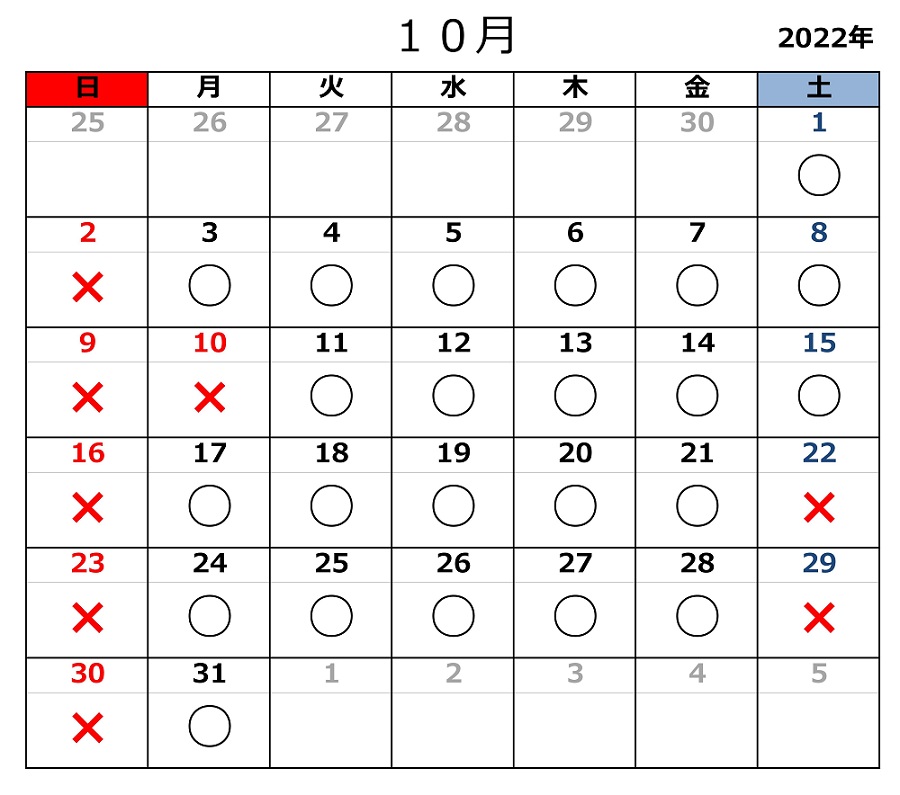 2022.09.21お知らせ 令和4年10月の開所日のお知らせ 黒〇=開所日 赤✕=閉所日 ※タスカルでは、基本「土」「日」「祝日」はお休みとさせていただきます。 また、各種お問い合わせは平日9:00~18:00にお願いいたします。 お問合せ TEL 011-717-5211 FAX 011-717-5212