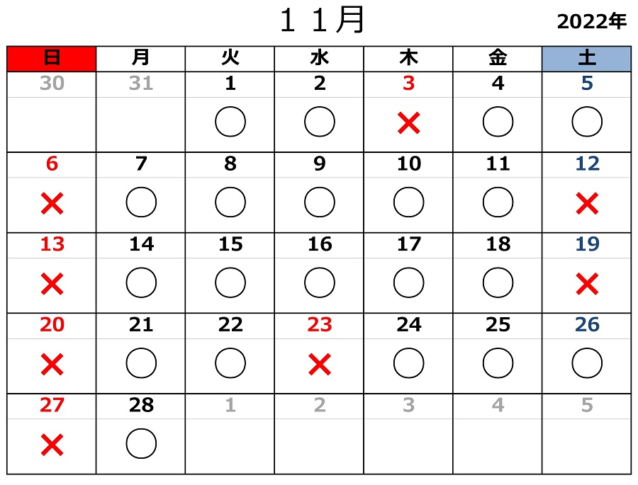 2022.10.19お知らせ 令和4年11月の開所日のお知らせ 黒〇=開所日 赤✕=閉所日 ※タスカルでは、基本「土」「日」「祝日」はお休みとさせていただきます。 また、各種お問い合わせは平日9:00~18:00にお願いいたします。 お問合せ TEL 011-717-5211 FAX 011-717-5212