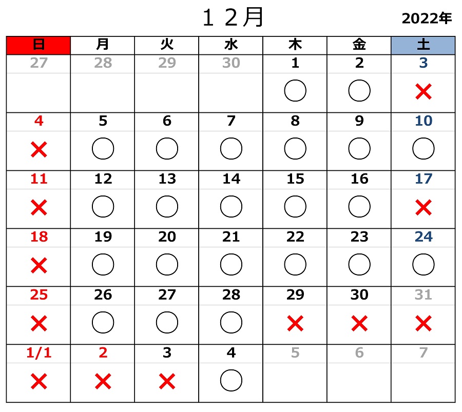 2022.11.26お知らせ 令和4年12月の開所日のお知らせ 黒〇=開所日 赤✕=閉所日 ※タスカルでは、基本「土」「日」「祝日」はお休みとさせていただきます。 また、各種お問い合わせは平日9:00~18:00にお願いいたします。 お問合せ TEL 011-717-5211 FAX 011-717-5212