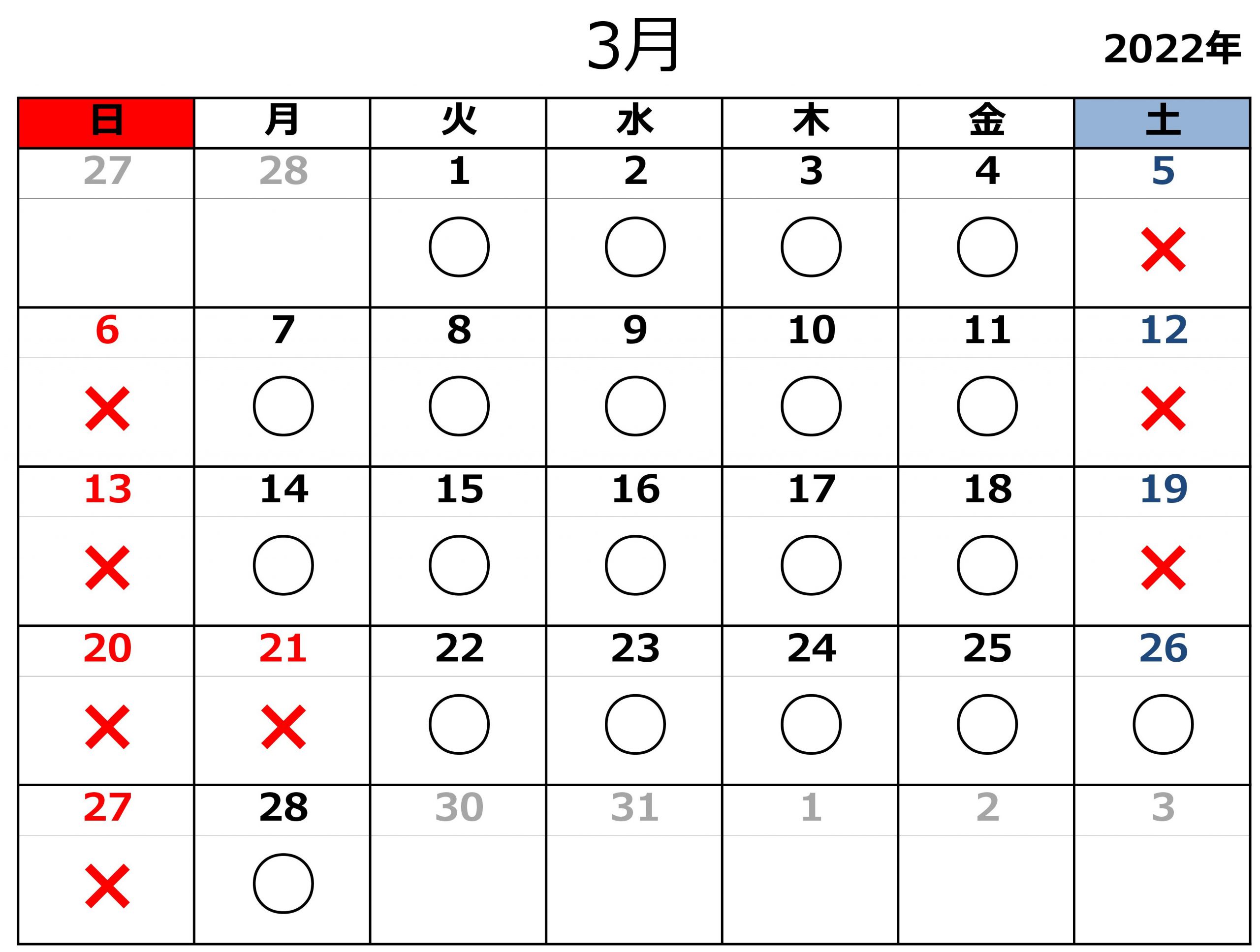 2022.02.26お知らせ 令和4年3月の開所日のお知らせ 黒〇=開所日 赤✕=閉所日 ※タスカルでは、基本「土」「日」「祝日」はお休みとさせていただきます。 また、各種お問い合わせは平日9:00~18:00にお願いいたします。 お問合せ TEL 011-717-5211 FAX 011-717-5212