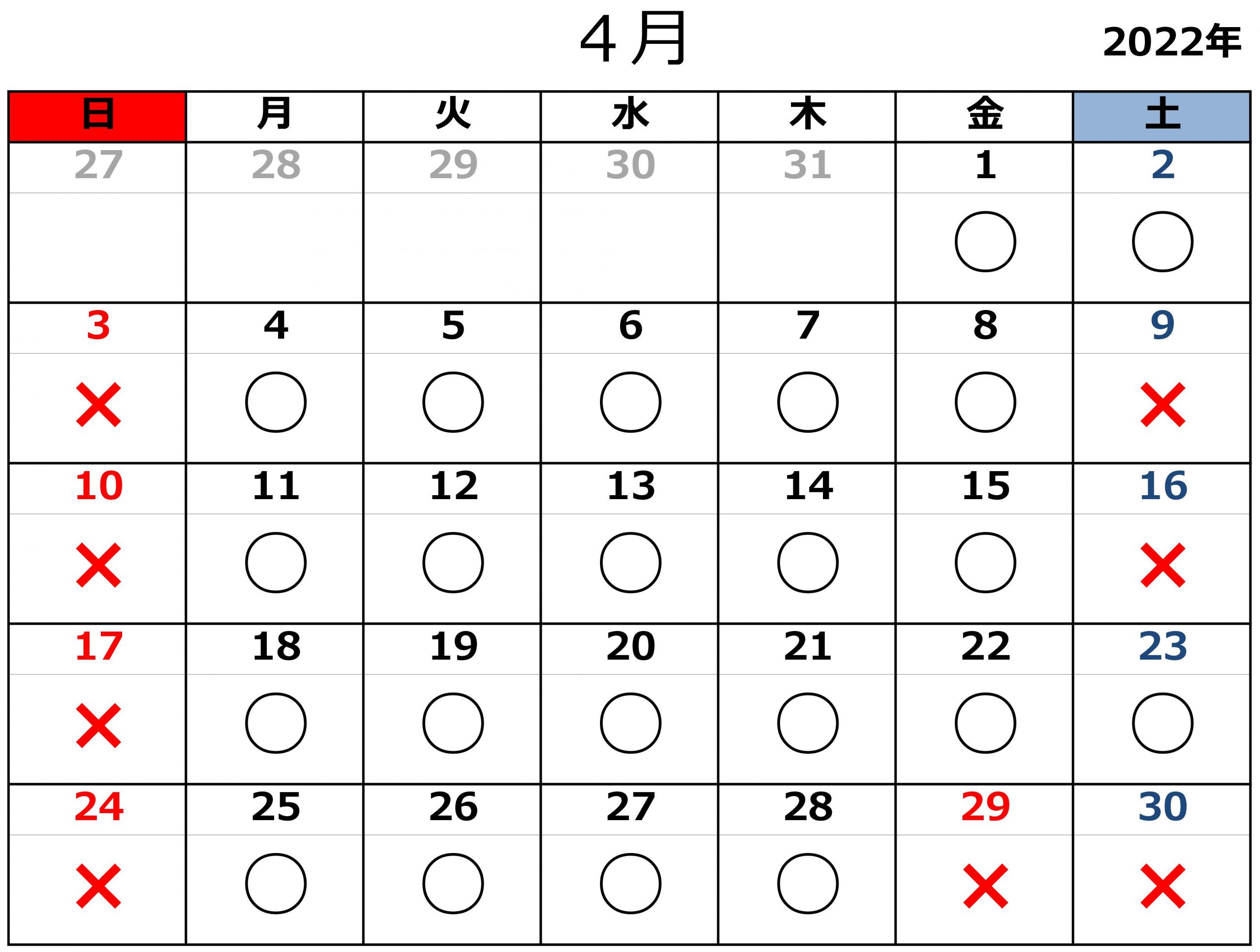 2022.03.23お知らせ 令和4年4月の開所日のお知らせ 黒〇=開所日 赤✕=閉所日 ※タスカルでは、基本「土」「日」「祝日」はお休みとさせていただきます。 また、各種お問い合わせは平日9:00~18:00にお願いいたします。 お問合せ TEL 011-717-5211 FAX 011-717-5212