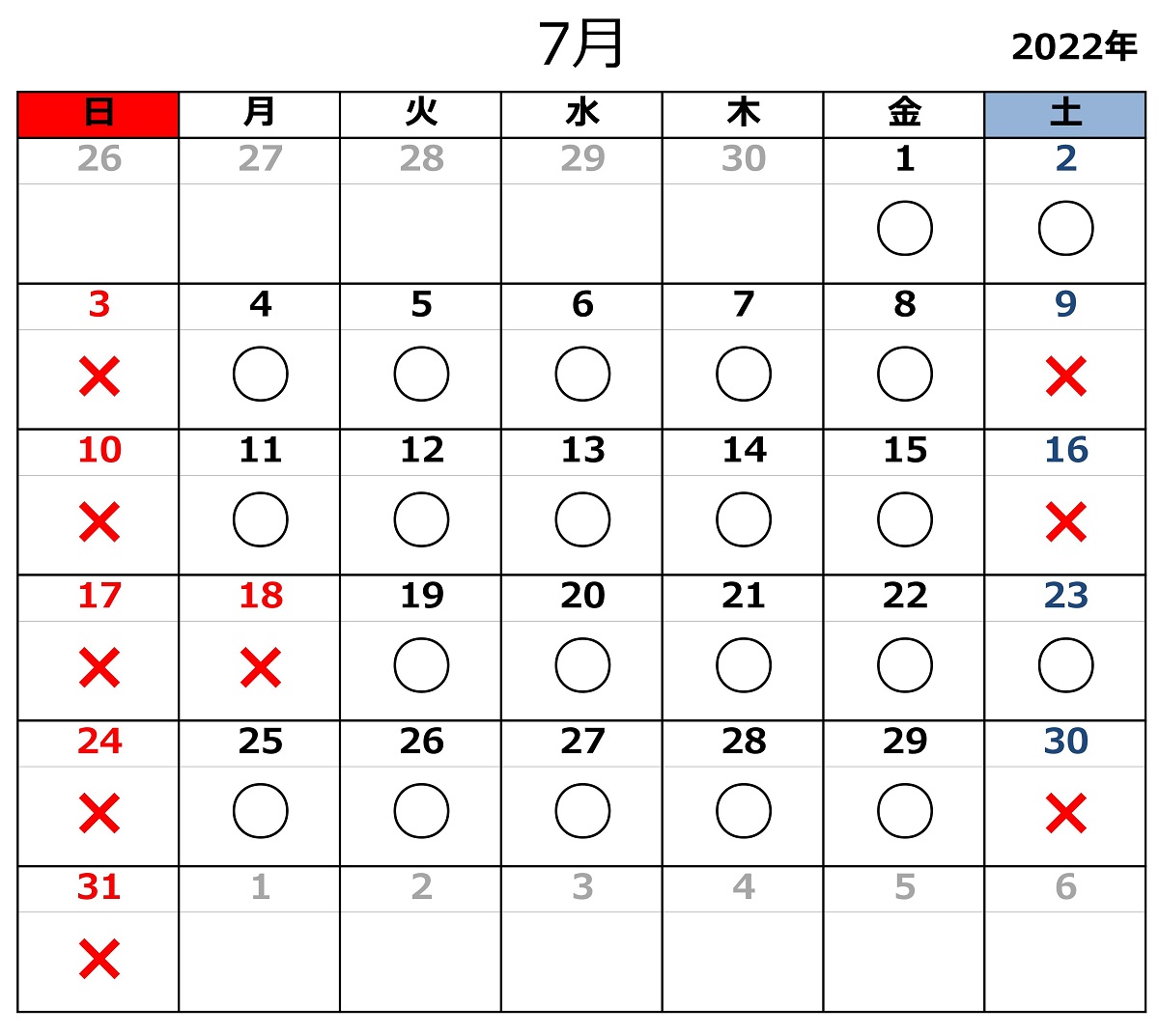 2022.06.23お知らせ 令和4年7月の開所日のお知らせ 黒〇=開所日 赤✕=閉所日 ※タスカルでは、基本「土」「日」「祝日」はお休みとさせていただきます。 また、各種お問い合わせは平日9:00~18:00にお願いいたします。 お問合せ TEL 011-717-5211 FAX 011-717-5212