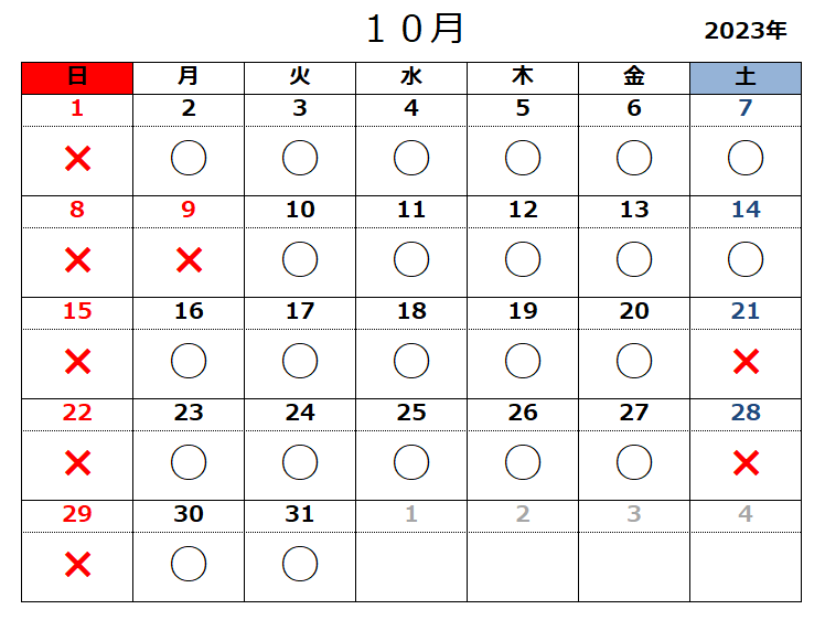 2023.09.20お知らせ 令和5年10月の開所日のお知らせ 黒〇=開所日 赤✕=閉所日 ※タスカルでは、基本「土」「日」「祝日」はお休みとさせていただきます。 また、各種お問い合わせは平日9:00~18:00にお願いいたします。 お問合せ TEL 011-717-5211 FAX 011-717-5212