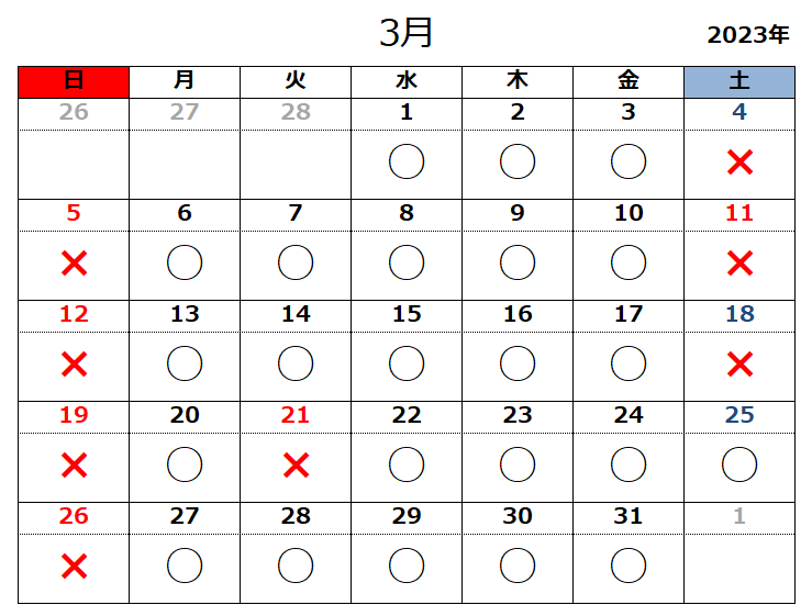 2023.02.22お知らせ 令和5年3月の開所日のお知らせ 黒〇=開所日 赤✕=閉所日 ※タスカルでは、基本「土」「日」「祝日」はお休みとさせていただきます。 また、各種お問い合わせは平日9:00~18:00にお願いいたします。 お問合せ TEL 011-717-5211 FAX 011-717-5212