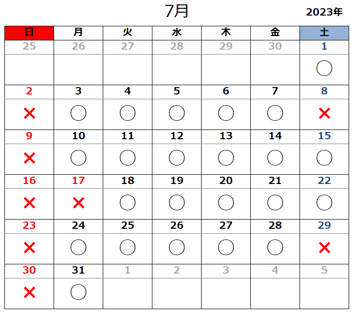2023.06.21お知らせ 令和5年7月の開所日のお知らせ 黒〇=開所日 赤✕=閉所日 ※タスカルでは、基本「土」「日」「祝日」はお休みとさせていただきます。 また、各種お問い合わせは平日9:00~18:00にお願いいたします。 お問合せ TEL 011-717-5211 FAX 011-717-5212