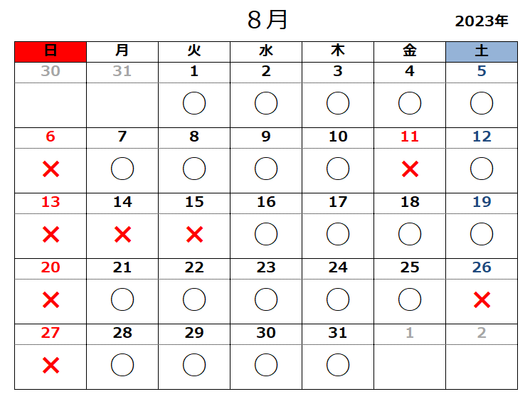 2023.07.26お知らせ 令和5年8月の開所日のお知らせ 黒〇=開所日 赤✕=閉所日 ※タスカルでは、基本「土」「日」「祝日」はお休みとさせていただきます。 また、各種お問い合わせは平日9:00~18:00にお願いいたします。 お問合せ TEL 011-717-5211 FAX 011-717-5212