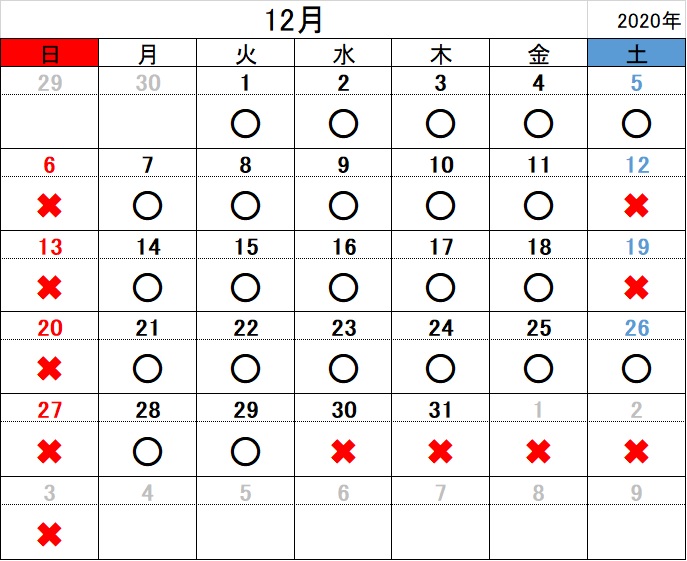 2020.12.01お知らせ 令和2年12月の開所日のお知らせ 黒〇=開所日 赤✖=閉所日 ※タスカルでは、基本「土」「日」「祝日」はお休み とさせていただきます。 年内の営業は12月29日まで、年明けの営業開始は1月4日からとさせていただきます。 また、各種お問い合わせは 平日9:00~18:00にお願いいたします。 お問合せ TEL 011-717-5211 FAX 011-717-5212
