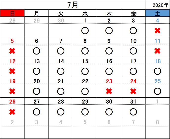 2020.06.20お知らせ 令和2年7月の開所日のお知らせ 黒〇=開所日 赤✖=閉所日 ※タスカルでは、基本「土」「日」「祝日」はお休み とさせていただきます。 また、各種お問い合わせは 平日9:00~18:00にお願いいたします。 お問合せ TEL 011-717-5211 FAX 011-717-5212