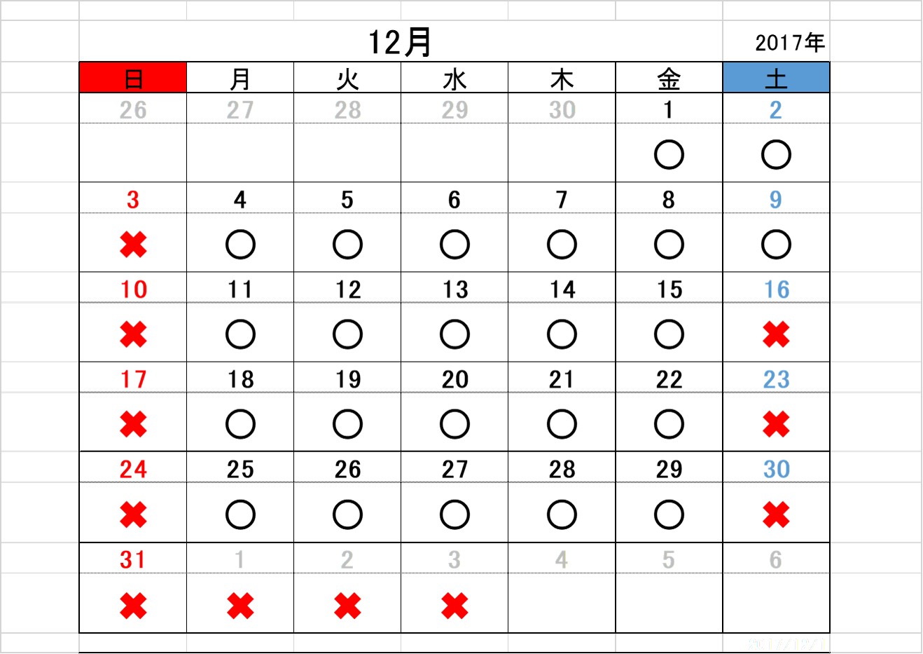 2017.11.20お知らせ 12月 開所日のお知らせ 黒〇=開所日 赤✖=閉所日 ※タスカルでは、基本「土」「日」「祝日」はお休み 12月は30日から翌月3日までは年末年始のお休み とさせていただきます。 また、各種お問い合わせは 平日9:00~18:00にお願いいたします。 お問合せ TEL 011-717-5211 FAX 011-717-5212