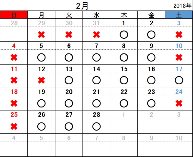 2018.01.22お知らせ 平成30年2月 開所日のお知らせ 黒〇=開所日 赤✖=閉所日 ※タスカルでは、基本「土」「日」「祝日」はお休み とさせていただきます。 また、各種お問い合わせは 平日9:00~18:00にお願いいたします。 お問合せ TEL 011-717-5211 FAX 011-717-5212