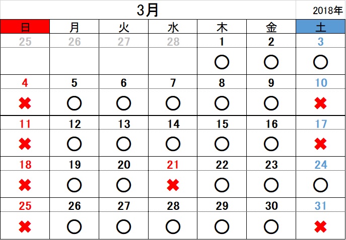 2018.02.20お知らせ 平成30年3月 開所日のお知らせ 黒〇=開所日 赤✖=閉所日 ※タスカルでは、基本「土」「日」「祝日」はお休み とさせていただきます。 また、各種お問い合わせは 平日9:00~18:00にお願いいたします。 お問合せ TEL 011-717-5211 FAX 011-717-5212
