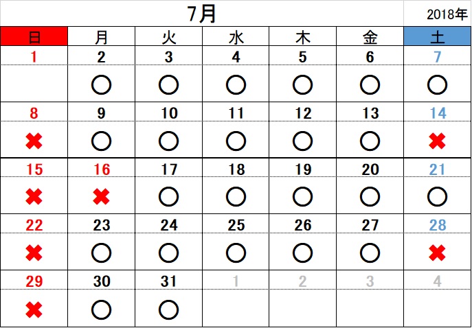 2018.06.20お知らせ 平成30年7月 開所日のお知らせ 黒〇=開所日 赤✖=閉所日 ※タスカルでは、基本「土」「日」「祝日」はお休み とさせていただきます。 また、各種お問い合わせは 平日9:00~18:00にお願いいたします。 お問合せ TEL 011-717-5211 FAX 011-717-5212