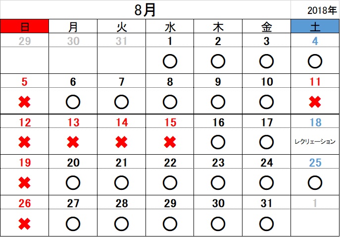 2018.07.21お知らせ 平成30年8月 開所日のお知らせ 黒〇=開所日 赤✖=閉所日 ※タスカルでは、基本「土」「日」「祝日」はお休み とさせていただきます。 8月は11~15日はお盆休み 18日はレクリェーションの為、ご連絡いただいても 対応できません。 また、各種お問い合わせは 平日9:00~18:00にお願いいたします。 お問合せ TEL 011-717-5211 FAX 011-717-5212