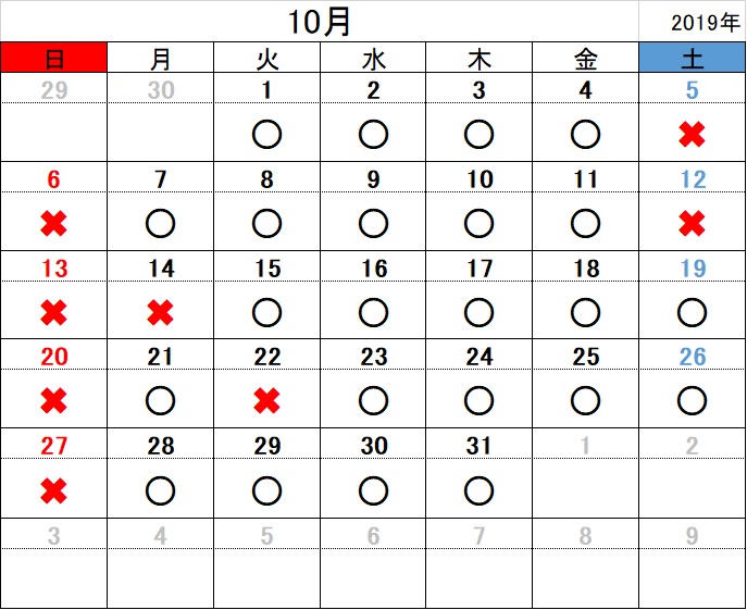 2019.09.20お知らせ 令和元年10月 開所日のお知らせ 黒〇=開所日 赤✖=閉所日 ※タスカルでは、基本「土」「日」「祝日」はお休み とさせていただきます。 また、各種お問い合わせは 平日9:00~18:00にお願いいたします。 お問合せ TEL 011-717-5211 FAX 011-717-5212