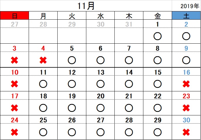 2019.10.20お知らせ 令和元年11月 開所日のお知らせ 黒〇=開所日 赤✖=閉所日 ※タスカルでは、基本「土」「日」「祝日」はお休み とさせていただきます。 また、各種お問い合わせは 平日9:00~18:00にお願いいたします。 お問合せ TEL 011-717-5211 FAX 011-717-5212