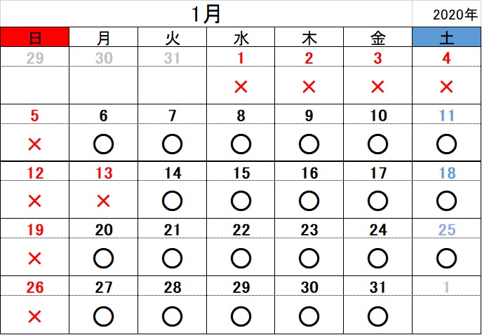 2019.12.27お知らせ 令和2年1月の開所日のお知らせ 黒〇=開所日 赤✖=閉所日 ※タスカルでは、基本「土」「日」「祝日」はお休み とさせていただきます。 当事業所は1月6日より業務を開始いたします。 また、各種お問い合わせは 平日9:00~18:00にお願いいたします。 お問合せ TEL 011-717-5211 FAX 011-717-5212